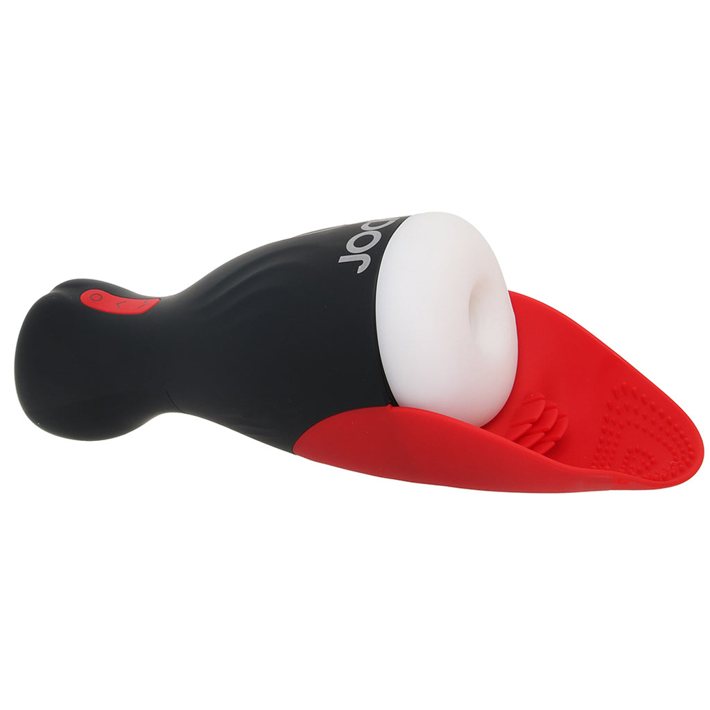 Waiting inside (and a little outside) a sturdy, easy grip case with a travel-friendly cap, Jock's super soft sleeve invites you/them into a wonderland of stroking potential. Meanwhile, the flickery, tickly silicone tongue below teases your 'taint.